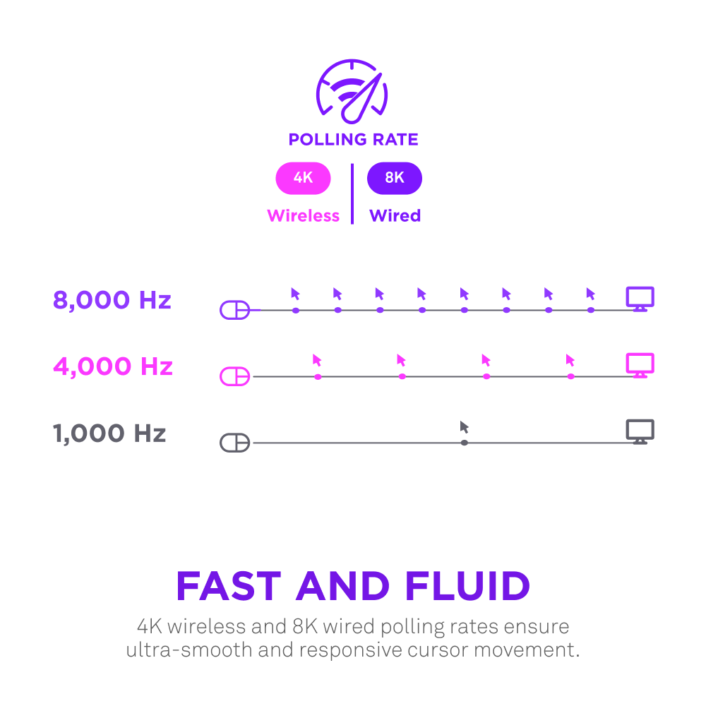 - 4K/8K Polling Rates: Ultra-smooth, responsive cursor movement with 4,000 Hz wireless and 8,000 Hz wired polling, ideal for high-refresh-rate monitors.