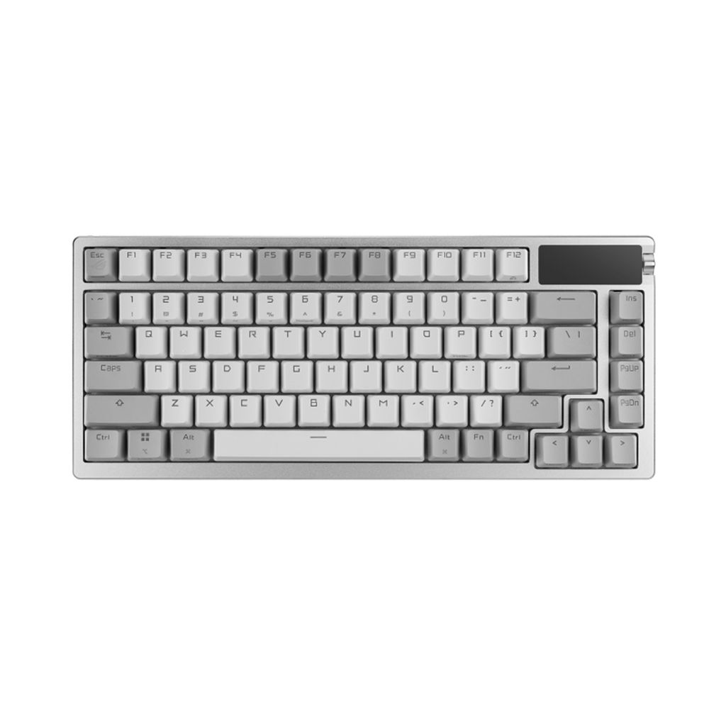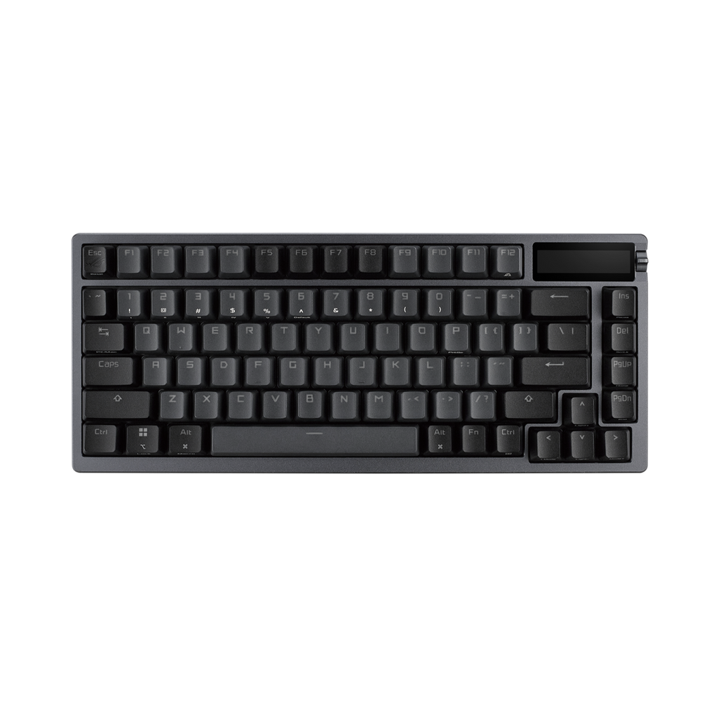 ROG Azoth gaming custom keyboard with 75 keyboard form factor, gasket mount, three-layer dampening foam and metal top cover, highly customizable with hot-swappable pre-lubed ROG NX mechanical switches, ROG keyboard stabilizers, PBT doubleshot keycaps and lube kit, tri-mode connection with 2.4 GHz SpeedNova technology, OLED display, three-way control knob, three tilt angles, and Mac support